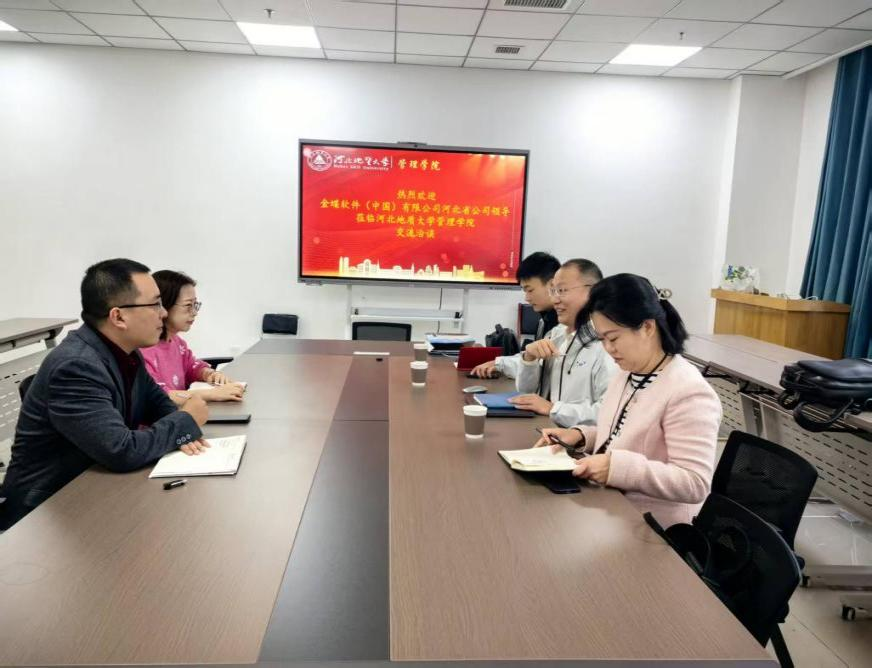 10月15日上午在河北地质大学管理学院会议室,管理学院与金蝶软件有限公司围绕校企合作开展深度交流座谈。管理学院副院长胡海川、实验中心主任李芊、金蝶软件有限公司培训教育事业部总经理王雪、金蝶软件有限公司河北省公司总经理张永朝及李昂然共同出席会议,就产教融合、资源共享、人才培养等关键议题展开热烈探讨。