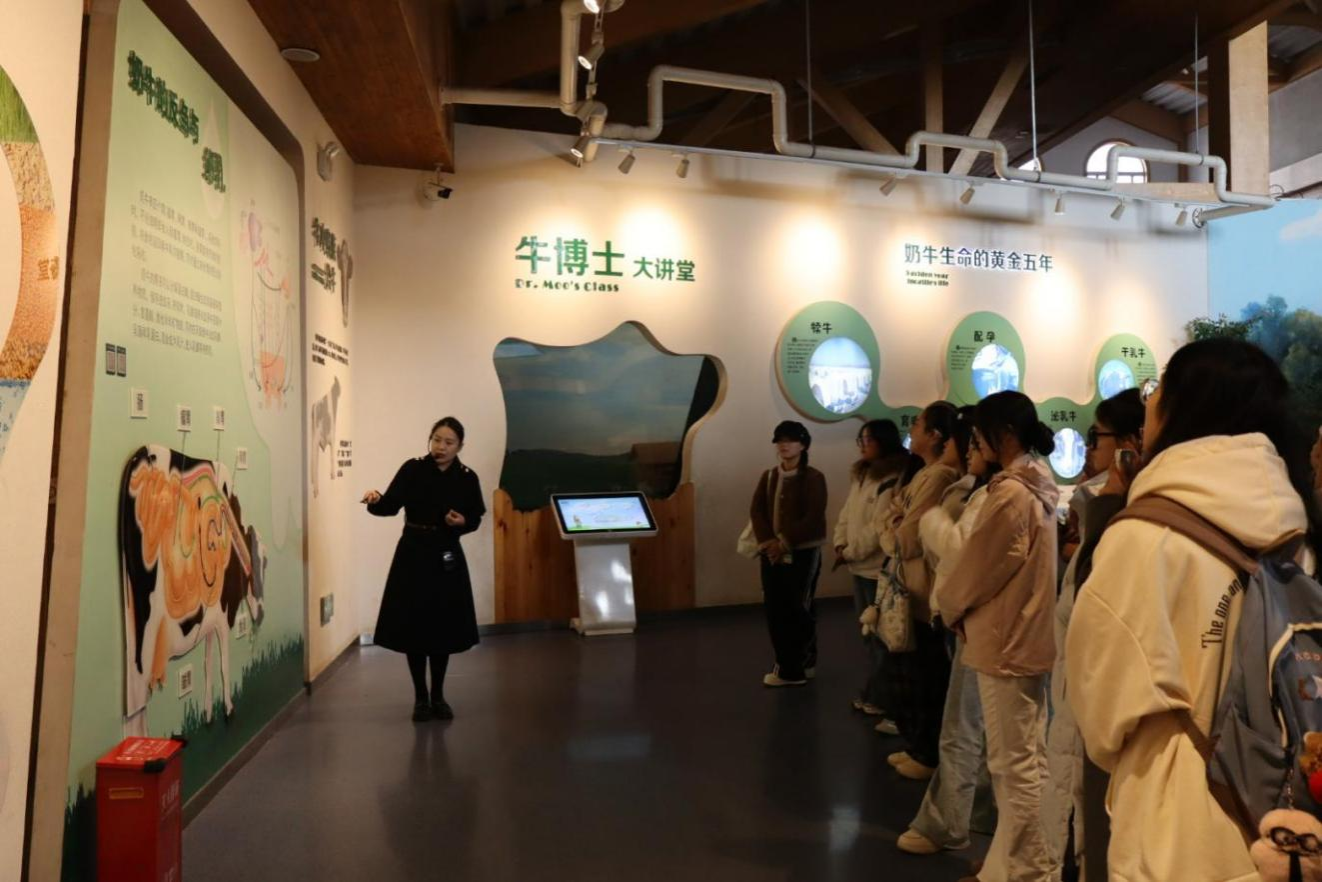 在奶牛科普馆内,图文并茂的展板、互动性强的模型、生动形象的多媒体演示等多种丰富多彩的表现形式,生动而详尽地展示了奶牛品种的培育历程、养殖技术的不断进步以及乳制品的营养知识等丰富内容。专业教师杨老师结合展馆的规划设计特点,深入指出:“科普馆不仅将知识的传授与趣味性的体验完美地融合在一起,这种‘寓教于游’的创新模式,正是旅游地学与规划工程专业在进行乡村旅游、研学旅游项目规划时所需要积极借鉴的宝贵经验。未来,我们还可以进一步探索将党建元素有机融入乡村旅游规划之中,打造出既具有红色教育意义又兼具产业科普功能的特色旅游线路,从而为游客提供更加多元化和富有教育意义的旅游体验。”