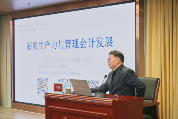11月5日下午,由中国会计学会、全国会计专业学位研究生教育指导委员会主办,河北地质大学管理学院承办的“MPAcc会计名家公益大讲堂”在校行政楼315报告厅举行。作为MPAcc教育二十周年系列活动,财政部管理会计咨询专家、全国会计专业学位研究生教育指导委员会委员,中央财经大学会计学院刘俊勇教授受邀作题为“新质生产力与管理会计发展”的学术讲座。讲座由管理学院院长白翠玲教授主持,MPAcc导师及学院师生代表120余人参加了本次讲座。
