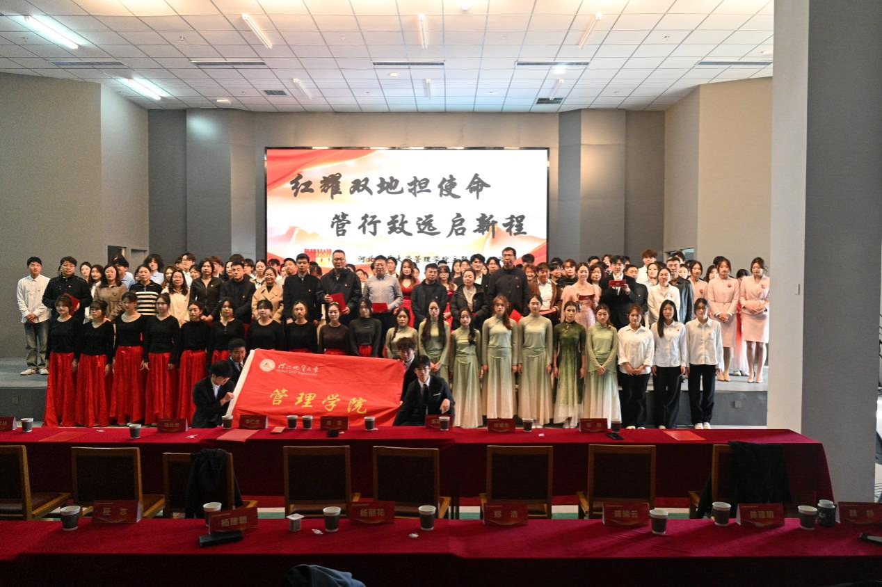 整场活动主题鲜明、情感真挚,既是理想信念的生动教育,也是青春力量的集中展示。管理学院师生党员代表用艺术语言诠释了“红耀双地”的精神内涵,彰显了新时代青年听党话、跟党走,勇担使命、奋发有为的昂扬姿态。管理学院全体师生将以此次党日活动为契机,继续坚守初心、勇担使命,在“管行致远”的征程中不断奋进,为实现中华民族伟大复兴的中国梦贡献青春与智慧。