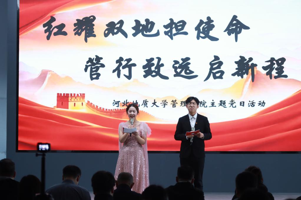 为深入学习贯彻党的二十届四中全会精神,发挥“红耀双地”党建品牌的引领作用,11月13日中午12时30分,河北地质大学管理学院“红耀双地担使命,管行致远启新程”主题党日活动在风味苑三楼学生活动中心隆重举行。活动特别邀请了校党委副书记都沁军、校党委副书记王彦东、校团委书记马沁芳、大学生就业指导与服务中心主任李仁杰、马克思主义学院党总支书记吴聪聪、党委组织部副部长潘军明、党委宣传部副部长张耀东、学生工作处副处长王祥等领导,管理学院党委书记周雪、管理学院党委副书记张颢以及管理学院各党支部书记、师生党员代表共同参加了此次活动。
