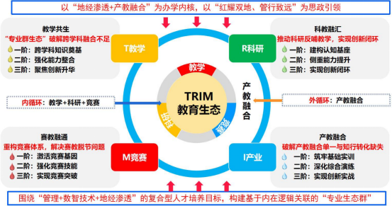 立足于河北地质大学管理学院的学科发展整体布局,面向会 计学、旅游管理、工商管理等 9 个本科专业,以“地经渗透+产教融 合”为办学内核,以“红耀双地、管行致远”为思政引领,系统解 决管理类复合型人才培养中的关键问题。成果构建了以“TRIM”为 核心理念的教育生态(T-教学,R-科研,I-产业,M-竞赛),推动教学共生、科教融汇、产教融合与赛教融通四维深度融合,形成“内循环(教学+科研+竞赛)+外循环(产教融合)”双轮驱动机制,实 现“基础→融合→创新”三阶递进培养模式,实现学生知识、能力 与 素 养 的 阶 梯 式 跃 升 , 重 塑 管 理 类 人 才 培 养 新 范 式 。“TRIM”教育生态的有效运行,不仅依托于其所倡导的先进理念,更依赖于系统化专业结构的支撑。为落实 TRIM 理念,学院围绕“管理+数智技术+地经渗透”的复合型人才培养目标,构建了基 于内在逻辑关联的“专业生态群”,通过“共建课程平台、共享实 验资源、共担学科项目”的共享机制,实现从“单业作战”到“多业协同”的转变,实现理念向实践的有效转化。在运行机制上,依托“内循环+外循环”的双轮驱动模式,实现校内资源与产业需求 的有效对接,赋能人才培养的实战性与前瞻性。在培养路径上,实施“基础→融合→创新”三阶递进体系,逐步引导学生从知识积累走向能力整合与素养升华,实现知识、能力与素养的阶梯式跃升, 从而重塑具有地大特色的管理类人才培养新范式。